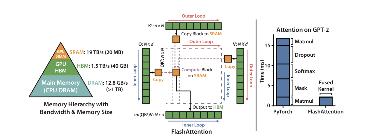 *Note: FlashAttention reduces memory usage from O(N2) to O(N) but maintains O(N2) computational complexity (FLOPs). The speedup comes from optimizing memory I/O (HBM ↔ SRAM), not reducing arithmetic operations.